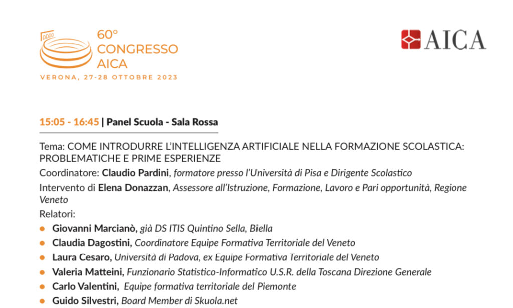 On October 27, 2023, I took part in the School Panel at the 60th AICA Annual Congress in Verona, dedicated to “How to introduce Artificial Intelligence in school education: challenges and first experiences.”