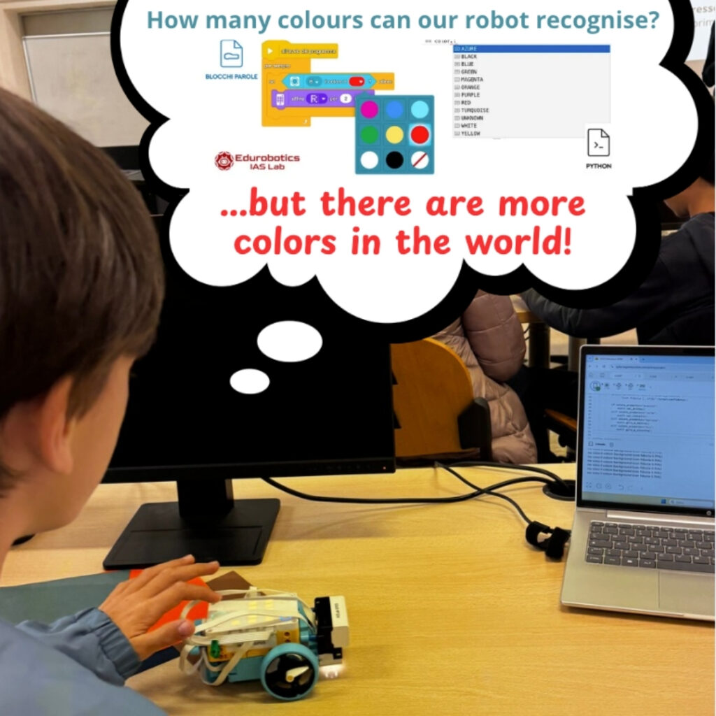 The question we started from: can a robot learn to recognise colours it has never seen before? Through a hands-on exploration of machine learning basics, students discovered how AI techniques can be used to teach robots to recognise colours and navigate their environment, while also seeing how robotics can be a concrete tool to support the learning of curricular subjects such as science, mathematics, geography and Italian.